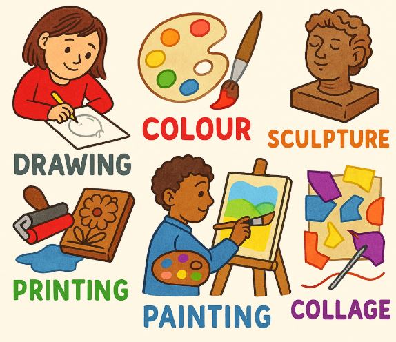 Our bespoke Art and Design curriculum is carefully sequenced from EYFS to Year 6 and is built around three core areas: drawing and painting, printing and collage, and sculpture and textiles. Through each phase, children progressively build their skills, develop control over tools and materials, and begin to apply their understanding in increasingly sophisticated ways.